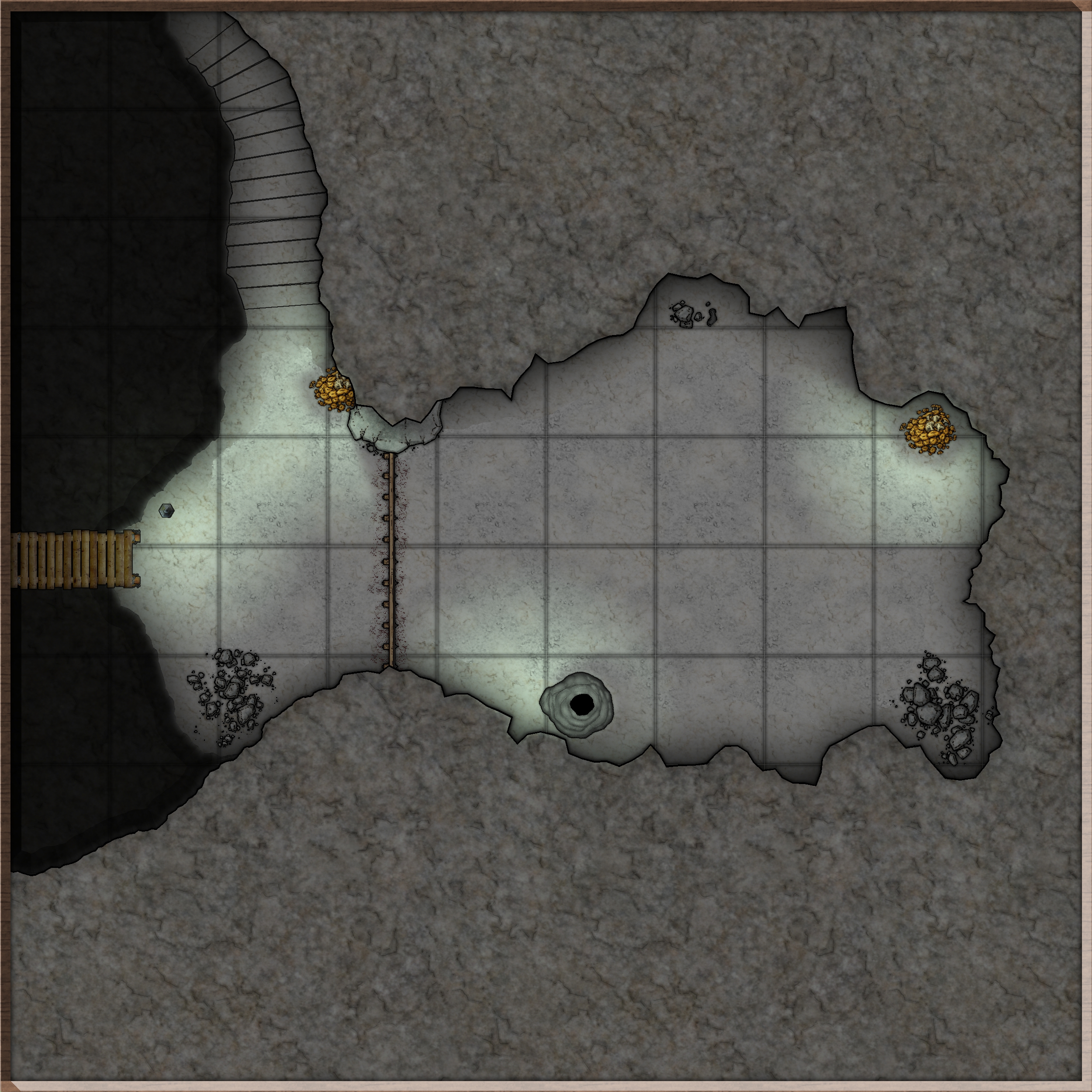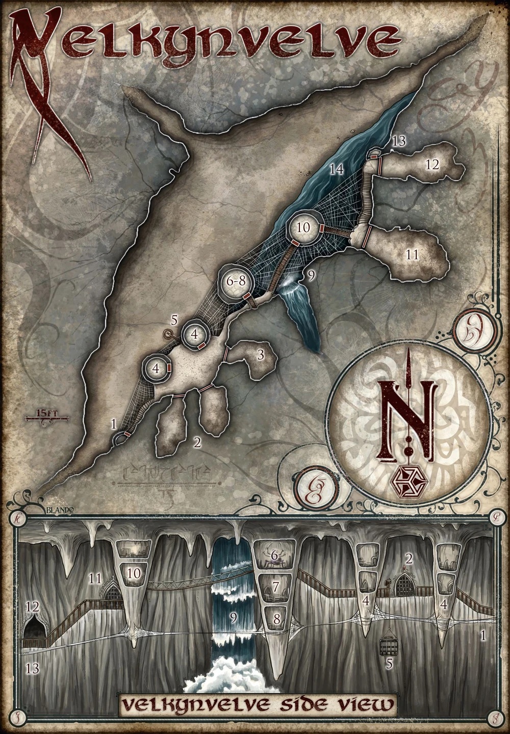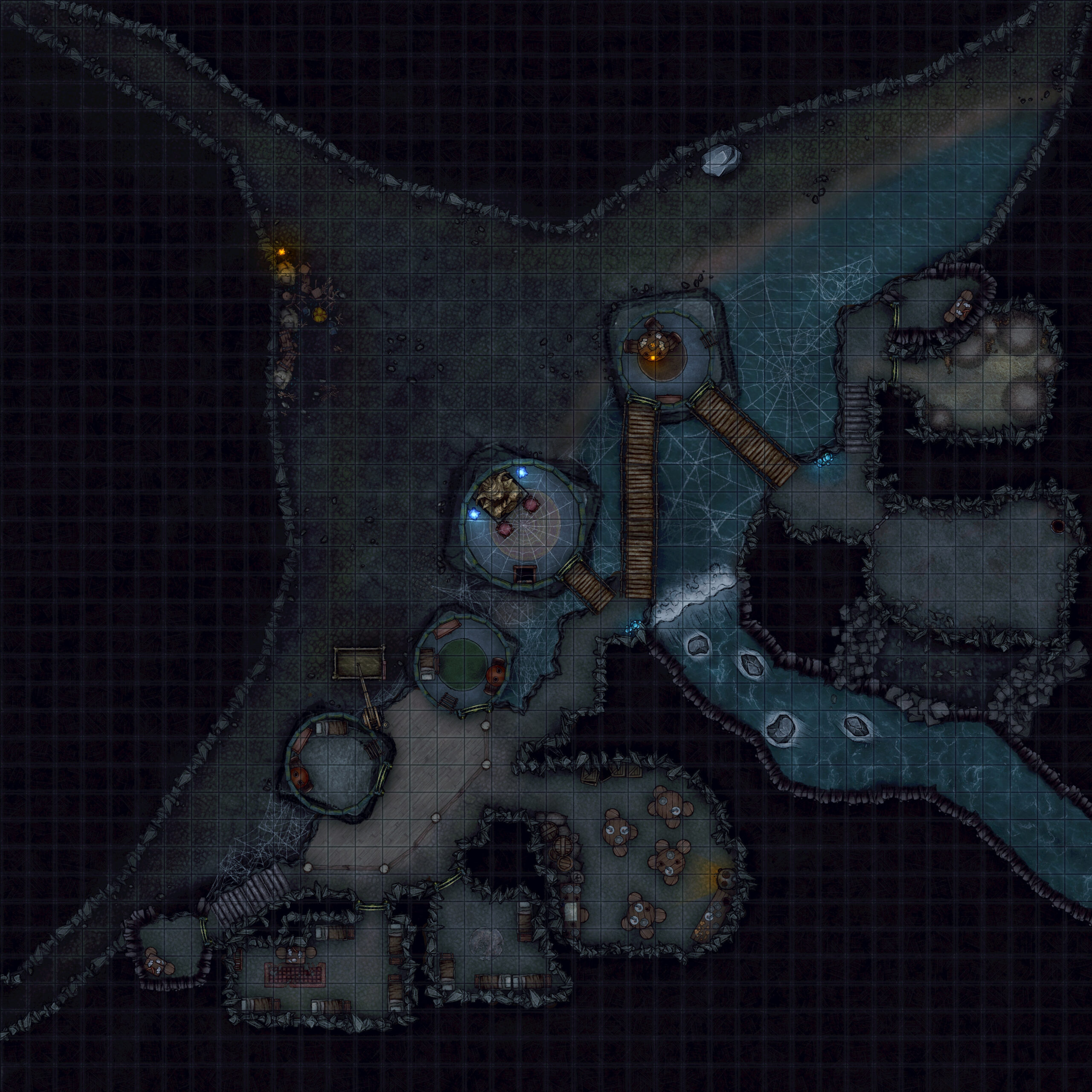 The drow outpost is located high in a cavern. Built 100 feet above the rocky floor. The· outpost consists of a series of small caves, in the cavern walls and four hanging towers, hollowed-out stalactites connected by walkways, stairs, and rope bridges. The towers are concealed by the thick webs of giant spiders that stretch below them, so that only the lowermost parts of the stalactites are visible from the cavern floor.