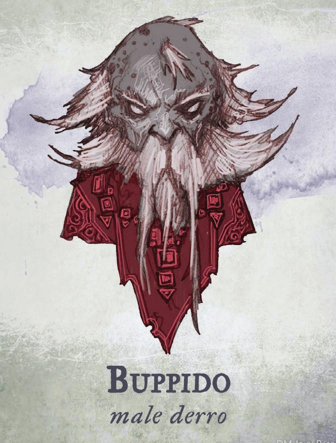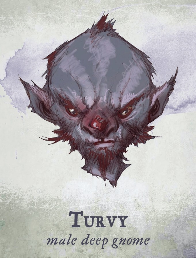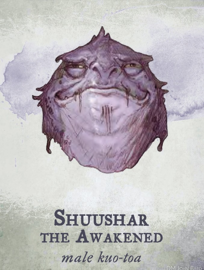 There is a very motley crew in the slave that consists of Buppido, a talkative and cunning derro, Prince Derendil, a quaggoth who claims to be a cursed elven prince, Eldeth Feldrun, a dwarven scout from Gauntlgrym, Jimjar, a svirfneblin with a gambling problem, Ront, a hulking orc bully, Sarith Kzekarit, a twitchy drow accused of murder, Shuushar the Awakened, an outcast kuo-toa hermit and mystic, Stool, a myconid sprout, and the twins, Topsy and Turvy who are feral little svirfneblin.. The the newcomers; Obelisk, a burly bruiser of a minotaur, Werv, a skeevy, foul-mouthed goblin, a strange looking humanoid with pale, almost drow-like eyes named Tammuz, Baern Ironbrew is an entertaining dwarf-halfling mix, Crab is a tiefling with curving horns and a crabby attitude, and a barbarian of vague description.